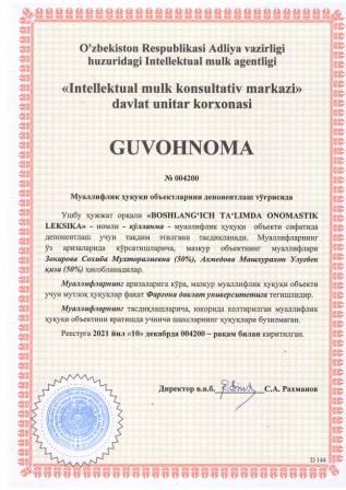| 5895 | №004200 | Қўлланма - BOSHLANG‘ICH TA‘LIMDA ONOMASTIK LEKSIKA" | Зокирова Сохиба Мухторалиевна (50%), Ахмедова Машхурахон Улуғбек қизи (50%) | Фарғона давлат университети | 12/10/2021 | ![]() |