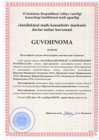 | 5897 | №004198 | Ўқув қўлланма - MATERIALSHUNOSLIK VA KONSTRUKSION MATERIALLAR" | Максудов Равшанжон Хасанович (25%), Отажонов Салим Мадрахимович (25%), Шухратов Шароф Шухратович (25%), Рахманкулов Махаммаджон Хамракулович (25%) | Фарғона давлат университети | 12/10/2021 | ![]() |