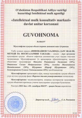 | 5898 | №004197 | Ўқув қўлланма - "ИННОВАЦИОН ТАЪЛИМДА ДАРС ШАКЛИ, МЕТОДИ ВА ВОСИТАЛАРИНИ ТАНЛАШ" | Максудов Равшанжон Хасанович (20%), Отажонов Салим Мадрахимович (20%), Ахмедов Махаматжон Мамадалиевич (20%), Шухратов Шароф Шухратович (20%), Хожикаримова Гуласал Таджиалиевна (20%) | Фарғона давлат университети | 12/10/2021 | ![]() |