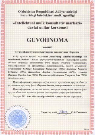 | 5900 | №004195 | Ўқув-услубий қўлланма - "Aylanma jismlarning kombinatsiyalariga oid masalalarni yechish" | Кодиров Комилжон Рахимович (20%), Кодирова Хаитгул Кубаевна (20%), Нишонбоев Азизбек Солижонович (20%), Ахмедов Олимхон Улугбек ўғли (20%), Йигиталиев Йўлдошали Умаржон ўғли (20%) | Фарғона давлат университети | 12/10/2021 | ![]() |