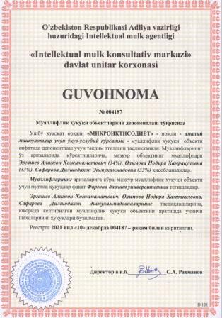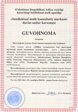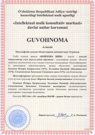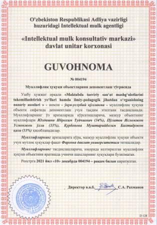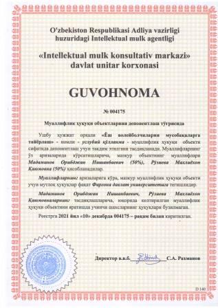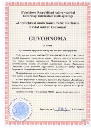 | 5915 | №004180 | Услубий кўрсатма - "IMZONING GRAFOLOGIK TAHLILI" | Солиев Фарходжон Содиқович (35%), Ражабов Муродилжон Жумабоевич (35%), Бутаев Бахромжон Шарофитдинович (30%) | Фарғона давлат университети | 12/10/2021 | ![]() |