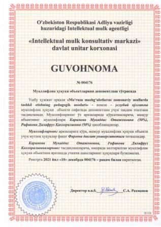 | 5919 | №004176 | Услубий қўлланма - "Ma‘ruza mashg‘ulotlarini zamonaviy usullarda tashkil etishning pedagogik asoslari" | Каримова Мукаддас Отажоновна (50%), Рафикова Дилафруз Қаххоралиевна (50%) | Фарғона давлат университети | 12/10/2021 | ![]() |