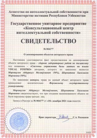 | 5918 | №004177 | Сборник лабораторных работ по дисциплину - "Системы управления базы данных на языке VISUAL FOXPRO" | Мирзақулов Абдурасул Мелиқўзиевич (50%), Шерматова Хилолахон Мирзаевна (50%) | Ферганский государственный университет | 12/10/2021 | ![]() |