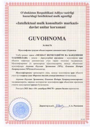 | 5917 | №004178 | Ўқув-услубий кўрсатма - "МЕҲНАТ ИҚТИСОДИЁТИ ВА БАНДЛИКНИ ТАЪМИНЛАШ" | Ахунова Огулхан Эргашовна (50%), Олимова Нодира Хамракуловна (50%) | Фарғона давлат университети | 12/10/2021 | ![]() |