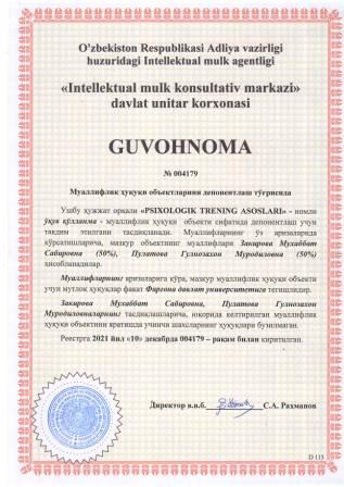 | 5916 | №004179 | Ўқув қўлланма - "PSIXOLOGIK TRENING ASOSLARI" | Закирова Мухаббат Сабировна (50%), Пулатова Гулнозахон Муродиловна (50%) | Фарғона давлат университети | 12/10/2021 | ![]() |