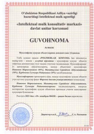| 5914 | №004181 | Услубий кўрсатма - "POLIMERLAR KIMYOSI" fani laboratoriya mashg‘uloti | Нишонов Миркозимжон (40%), Маматқулова Сурайёхон Абдусаматовна (30%), Қурбонова Гулчехра Райимовна (30%) | Фарғона давлат университети | 12/10/2021 | ![]() |