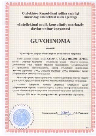 | 5913 | №004182 | Услубий қўлланма - "МЕТАЛЛАРГА ҚЎЛДА ИШЛОВ БЕРИШ" | Ахмедов Турсунбай (34%), Усманов Якубжан (33%), Отажонов Салим Мадрахимович (33%) | Фарғона давлат университети | 12/10/2021 | ![]() |