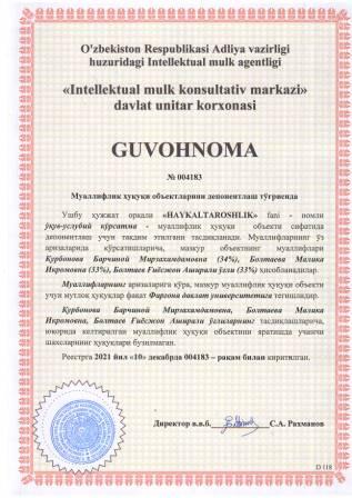 | 5912 | №004183 | Ўқув-услубий кўрсатма - "HAYKALTAROSHLIK" fani | Қурбонова Барчиной Мирзахамдамовна (34%), Болтаева Малика Икромовна (33%), Болтаев Ғиёсжон Аширали ўғли (33%) | Фарғона давлат университети | 12/10/2021 | ![]() |