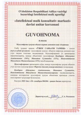 | 5911 | №004184 | Ўқув-услубий қўлланма - "ЎЗБЕК САНЪАТИ ТАРИХИ" | Қамбаров Абдумутал Ахаджонович (34%), Маннапов Султанбек (33%), Нажметдинова Мавлудахон Мамасодиковна (33%) | Фарғона давлат университети | 12/10/2021 | ![]() |