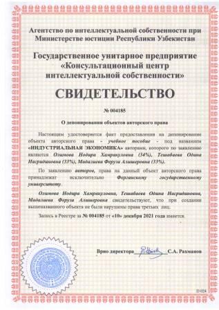 | 5910 | №004185 | Учебное пособие - "ИНДУСТРИАЛЬНАЯ ЭКОНОМИКА" | Олимова Нодира Хамракуловна (34%), Тешабаева Одина Насридиновна (33%), Мадалиева Феруза Алишеровна (33%) | Ферганский государственный университет | 12/10/2021 | ![]() |