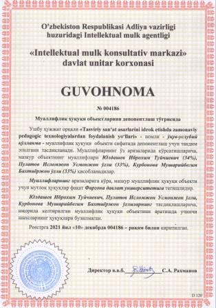 | 5909 | №004186 | Ўқув-услубий қўлланма - "Tasviriy san‘at asarlarini idrok etishda zamonaviy pedagogic texnologiyalardan foydalanish yo‘llari" | Юлдашев Иброхим Туйчиевич (34%), Пулатов Исломжон Усмонжон ўғли (33%), Курбонова Мушарийбегим Бахтиёржон ўғли (33%) | Фарғона давлат университети | 12/10/2021 | ![]() |