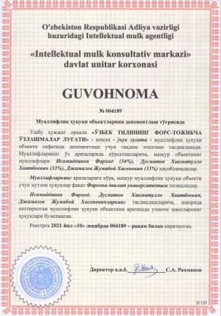 | 5906 | №004189 | Ўқув луғати - "ЎЗБЕК ТИЛИНИНГ ФОРС-ТОЖИКЧА ЎЗЛАШМАЛАР ЛУҒАТИ" | Исомиддинов Фарход (34%), Дусматов Хикматулло Хаитбоевич (33%), Джамалов Жумабой Хисенович (33%) | Фарғона давлат университети | 12/10/2021 | ![]() |