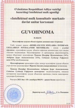 | 5904 | №004191 | Услубий кўрсатма - "BOSHLANG‘ICH SINFLARDA INTERFAOL USULLARDAN FOYDALANISH METODIKASI" | Ўринова Нилуфар Мухаммадовна (34%), Акбарова Зухро Акмалжоновна (33%), Содикова Гулбахор Ғофуржон қизи (33%) | Фарғона давлат университети | 12/10/2021 | ![]() |