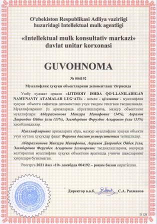 | 5903 | №004192 | Қўлланма - "IJTIMOIY ISHDA QO‘LLANILADIGAN NAMUNAVIY ATAMALAR LUG‘ATI" | Абдурахмонова Манзура Манафовна (34%), Акрамов Давронбек Ойбек ўғли (33%), Эгамбердиев Ферузбек Асқаржон ўғли (33%) | Фарғона давлат университети | 12/10/2021 | ![]() |