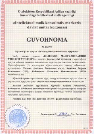 | 5920 | №004175 | Услубий қўлланма - "Ёш волейболчиларни мусобақаларга тайёрлаш" | Мадаминов Орибджан Нишанбаевич (50%), Рўзиева Махлиёхон Қаюмовна (50%) | Фарғона давлат университети | 12/10/2021 | ![]() |