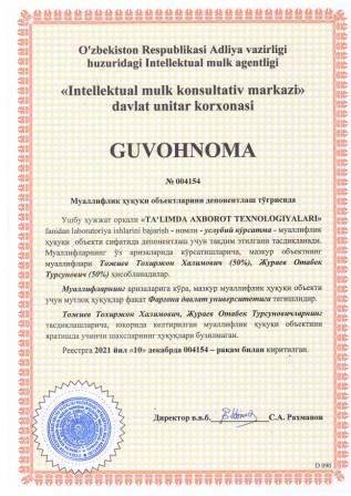 | 5940 | №004154 | Услубий кўрсатма - "TA‘LIMDA AXBOROT TEXNOLOGIYALARI" fanidan laboratoriya ishlarini bajarish | Тожиев Тохиржон Халимович (50%), Жураев Отабек Турсунович (50%) | Фарғона давлат университети | 12/10/2021 | ![]() |