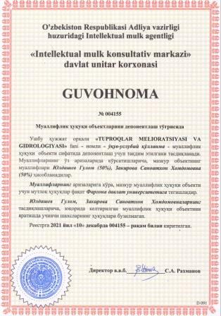 | 5939 | №004155 | Ўқув-услубий қўлланма - "TUPROQLAR MELIORATSIYASI VA GIDROLOGIYASI" fani | Юлдашев Гулом (50%), Закирова Саноатхон Хомдомовна (50%) | Фарғона давлат университети | 12/10/2021 | ![]() |