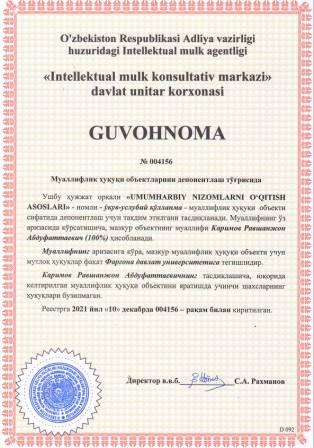 | 5938 | №004156 | Ўқув-услубий қўлланма - "UMUMHARBIY NIZOMLARNI O‘QITISH ASOSLARI" | Каримов Равшанжон Абдуфаттаевич (100%) | Фарғона давлат университети | 12/10/2021 | ![]() |