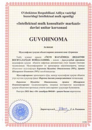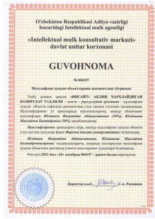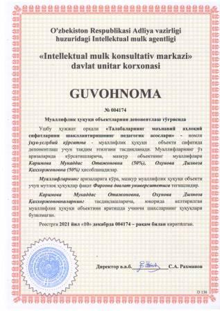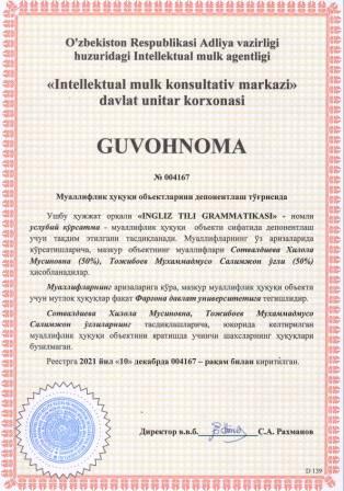 | 5927 | №004167 | Услубий кўрсатма - "INGLIZ TILI GRAMMATIKASI" | Сотвалдиева Хилола Мусиновна (50%), Тожибоев Мухаммадмусо Салимжон ўғли (50%) | Фарғона давлат университети | 12/10/2021 | ![]() |