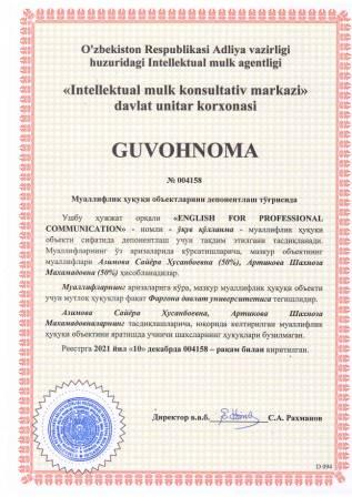 | 5936 | №004158 | Ўқув қўлланма - "ENGLISH FOR PROFESSIONAL COMMUNICATION" | Азимова Сайёра Хусанбоевна (50%), Артикова Шахноза Махамадовна (50%) | Фарғона давлат университети | 12/10/2021 | ![]() |