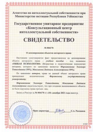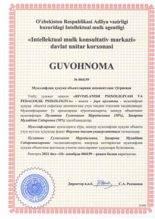| 5935 | №004159 | Ўқув қўлланма - "RIVOJLANISH PSIXOLIGIYASI VA PEDAGOGIK PSIXOLOGIYA" | Пулатова Гулнозахон Муродиловна (50%), Закирова Мухаббат Сабировна (50%) | Фарғона давлат университети | 12/10/2021 | ![]() |
