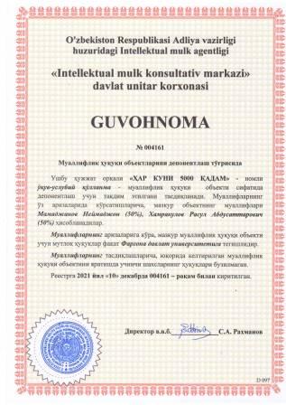 | 5933 | №004161 | Ўқув-услубий қўлланма - "ҲАР КУНИ 5000 ҚАДАМ" | Мамаджанов Неймаджон (50%), Хамракулов Расул Абдусаттарович (50%) | Фарғона давлат университети | 12/10/2021 | ![]() |