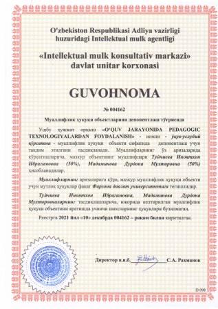 | 5932 | №004162 | Ўқув-услубий кўрсатма - "O‘QUV JARAYONIDA PEDAGOGIC TEXNOLOGIYALARDAN FOYDALANISH" | Туйчиева Иноятхон Ибрагимовна (50%), Мадаминова Дурдона Мухторовна (50%) | Фарғона давлат университети | 12/10/2021 | ![]() |