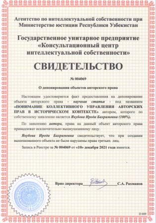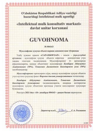 | 5931 | №004163 | Ўқув-услубий қўлланма - "САРАХБОРЛАР" | Камбаров Абдумутал Ахаджонович (50%), Тошалиев Дилшоджон Баходиржон ўғли (50%) | Фарғона давлат университети | 12/10/2021 | ![]() |
