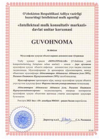 | 5930 | №004164 | Ўқув қўлланма - "SONATINALAR" (O‘zbekiston yosh kompozitorlarining fortepiano uchun asarlari) | Абдисаттаров Абдижалил Абдивали ўғли (50%), Рахимов Оматжон Нурмухаммадович (50%) | Фарғона давлат университети | 12/10/2021 | ![]() |