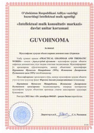 | 5929 | №004165 | Ўқув-услубий қўлланма - "PRACTICAL GRAMMAR AND THEMATIC WORDS" | Нурматова Мунисхон Машрабовна (50%), Исмоилова Дилоромхон Рустамжон қизи (50%) | Фарғона давлат университети | 12/10/2021 | ![]() |