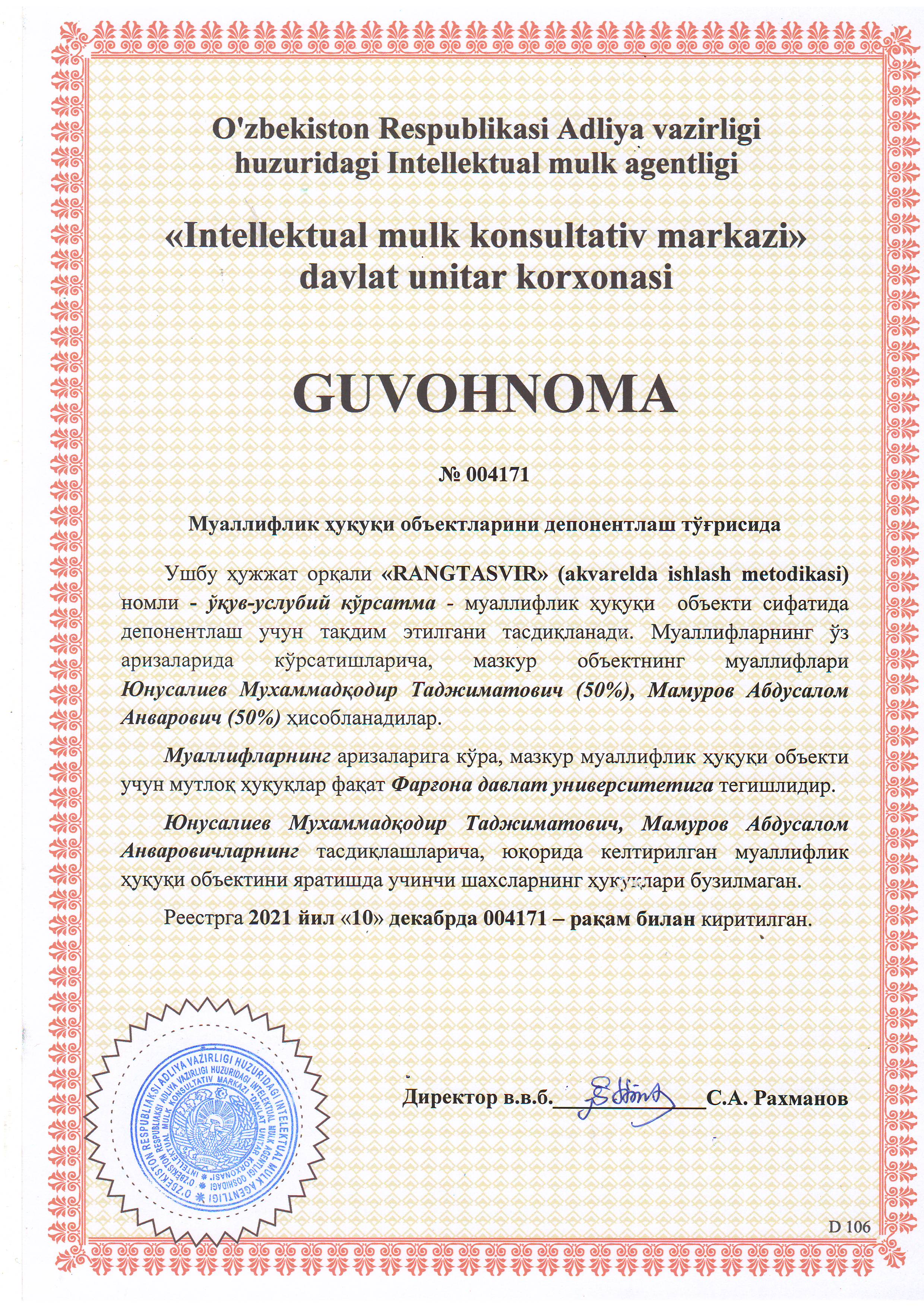 | 5923 | №004171 | Ўқув-услубий кўрсатма - "RANGTASVIR" (akvarelda ishlash metodikasi) | Юнусалиев Мухаммадқодир Таджиматович (50%), Мамуров Абдусалом Анварович (50%) | Фарғона давлат университети | 12/10/2021 | ![]() |