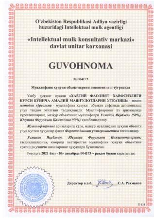 | 5922 | №004173 | Методик кўрсатма - "ХАЁТИЙ ФАОЛИЯТ ХАВФСИЗЛИГИ КУРСИ БЎЙИЧА АМАЛИЙ МАШҒУЛОТЛАРНИ ЎТКАЗИШ" | Усманов Якубжан (50%), Юсупова Ферузахон Комиловна (50%) | Фарғона давлат университети | 12/10/2021 | ![]() |