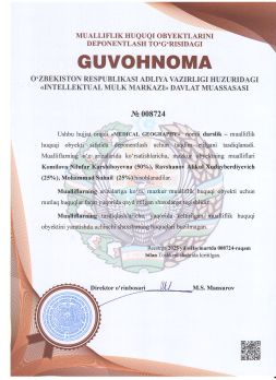 598 | №008724 | Darslik –"MEDICAL GEOGRAPHY" | Komilova Nilufar Karshiboyevna (50%), Ravshanov Alikul Xudayberdiyevich (25%), Mohammad Suhail (25%) | Komilova Nilufar Karshiboyevna, Ravshanov Alikul Xudayberdiyevich, Mohammad Suhail | 03/11/2025 | ![]() |