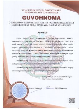 597 | №008725 | Xaritalar to‘plami – "OZBEKISTON RESPUBLIKASINING TIBBIY-GEOGRAFIK ATLASI. 2-QISM. TOSHKENT SHAHRI VA TOSHKENT VILOYATI" | Komilova Nilufar Karshiboyevna (25%), Zaynutdinova Dilnoza Kaxramonovna (25%), Maxmudov Bahodirjon Xakimjon o‘g‘li (25%), Nazarova Dilshodaxon Ochildinovna (25%) | Komilova Nilufar Karshiboyevna, Zaynutdinova Dilnoza Kaxramonovna, Maxmudov Bahodirjon Xakimjon o‘g‘li, Nazarova Dilshodaxon Ochildinovna | 03/11/2025 | ![]() |