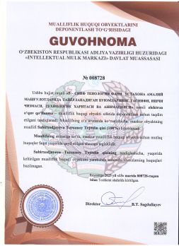 592 | №008730 | Elektron o‘quv qo‘llanma – " 7 - СИНФ ТЕНОЛОГИЯ ФАНИ УСТАХОНА АМАЛИЙ МАШҒУЛОТЛАРИДА ТАЙЁРЛАНАДИГАН БУЮМЛАРНИНГ ТАСНИФИ, ИШЧИ ЧИЗМАСИ, ТЕХНОЛОГИК ХАРИТАСИ ВА АНИМАЦИЯСИ" | Sabirxodjayeva Tursunoy Tojitdin qizi (100%) | Sabirxodjayeva Tursunoy Tojitdin qizi | 03/13/2025 | ![]() |