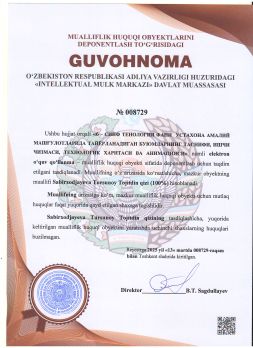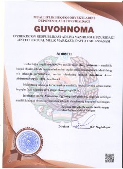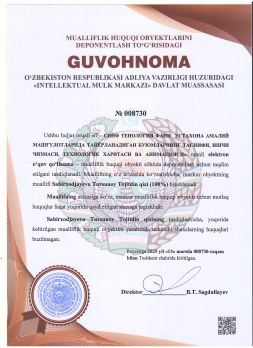 591 | №008731 | Ilmiy ishlanma – "DEPKNOW" | Jaloldinov Axror Abdusattor o‘g‘li (100%) | Jaloldinov Axror Abdusattor o‘g‘li | 03/13/2025 | ![]() |