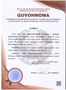 586 | №008736 | Monografiya –"ЗОЛОТОСОДЕРЖАЩИЕ РАССОЛЫ ЗАПАДНОГО УЗБЕКИСТАНА (перспективы освоения)" | Ibragimov Aziz Sabirovich (100%) | GIDROGEOLOGIYA VA INJENERLIK GEOLOGIYASI INSTITUTI» DM | 03/17/2025 | ![]() |