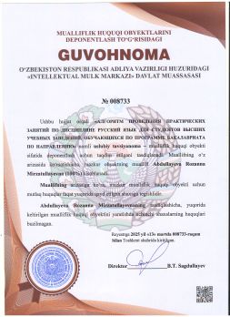589 | №008733 | Uslubiy tavsiyanoma –"АЛГОРИТМ ПРОВЕДЕНИЯ ПРАКТИЧЕСКИХ ЗАНЯТИЙ ПО ДИСЦИПЛИНЕ РУССКИЙ ЯЗЫК ДЛЯ СТУДЕНТОВ ВЫСШИХ УЧЕБНЫХ ЗАВЕДЕНИЙ, ОБУЧАЮЩИХСЯ ПО ПРОГРАММЕ БАКАЛАВРИАТА ПО НАПРАВЛЕНИЮ" | Abdullayeva Rozanna Mirzatullayevna (100%) | Abdullayeva Rozanna Mirzatullayevna | 03/13/2025 | ![]() |