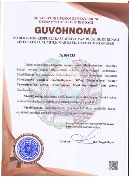 587 | №008735 | Tibbiy chat-bot – "AtopikDermabot" | Mirraximova Maktuba Xabibullayevna (40%), Nishanbayeva Nilufar Yunusdjonovna (40%), Abduvosiyeva Mushtariy Ismoil qizi (20%) | Mirraximova Maktuba Xabibullayevna, Nishanbayeva Nilufar Yunusdjonovna, Abduvosiyeva Mushtariy Ismoil qizi | 03/14/2025 | ![]() |