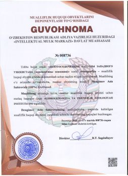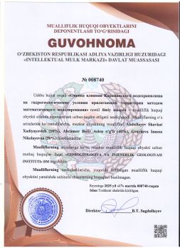 582 | №008740 | Ilmiy maqola – "Оценка влияния Kараманского водохранилища на гидрогеологические условия прилегающей территории методом математического моделирования" | Abdullayev Shavkat Xadiyayevich (10%), Akramov Botir Aslon o‘g‘li (40%), Gracheva Innesa Nikolayevna (50%) | «GIDROGEOLOGIYA VA INJENERLIK GEOLOGIYASI INSTITUTI» DM | 03/17/2025 | ![]() |