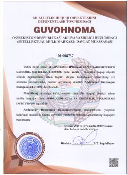 584 | №008738 | Xarita – "Разрез: «Выявление форм миграции основных катионов и анионов в подземных водах в пределах различных морфогенетических типов рельефа Приташкентского артезианского бассейна под воздействием антропогенных факторов»" | Abdullayev Baxromjon Dadajanovich (100%) | «GIDROGEOLOGIYA VA INJENERLIK GEOLOGIYASI INSTITUTI» DM | 03/17/2025 | ![]() |
