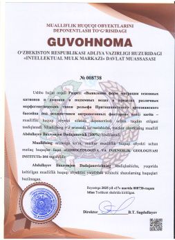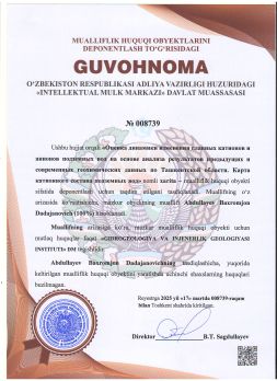 583 | №008739 | Xarita – "Оценка динамики изменения главных катионов и анионов подземных вод на основе анализа результатов предыдущих и современных геохимических данных по Ташкентской области. Карта катионного состава подземных вод" | Abdullayev Baxromjon Dadajanovich (100%) | «GIDROGEOLOGIYA VA INJENERLIK GEOLOGIYASI INSTITUTI» DM | 03/17/2025 | ![]() |