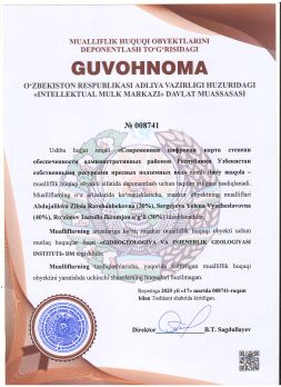 581 | №008741 | Ilmiy maqola – "Современная цифровая карта степени обеспеченности административных районов Республики Узбекистан собственными ресурсами пресных подземных вод" | Abdujalilova Zilola Ravshanbekovna (30%), Sergeyeva Yelena Vyacheslavovna (40%), Ro‘zimov Izatullo Ikromjon o‘g‘li (30%) | «GIDROGEOLOGIYA VA INJENERLIK GEOLOGIYASI INSTITUTI» DM | 03/17/2025 | ![]() |