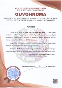 | 600 | №009512 | Ilmiy maqola – "LIVER DISEASE AND PREGNANCY" | Axtamova Maftuna Nodirovna (100%) | Axtamova Maftuna Nodirovna | 11/20/2025 | ![]() |