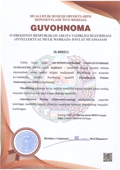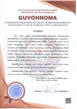 | 591 | №009521 | Ratsionalizatorlik taklifi – "УСОВЕРШЕНСТВИЕ МЕТОДОВ ДИАГНОСТИКИ ЦИТОКИНОВОГО СТАТУСА И БЕССИМПТОМНОЙ ГИПЕРУРИКЕМИИ У БОЛЬНЫХ С ОСТЕОАРТРИТОМ" | Miraxmedova Xilola To‘xtasinovna (17%), Nizametdinova Ulugoy Jamin qizi (17%), Saidrasulova Gulizebo Baxtiyor qizi (17%), Mirzaliyeva Anora Arginbayevna (17%), Srojidinov Sardoriddin Shamsitdin o‘g‘li (16%), Xaytimbetov Jumamurat Shamuratovich (16%) | Miraxmedova Xilola To‘xtasinovna, Nizametdinova Ulugoy Jamin qizi, Saidrasulova Gulizebo Baxtiyor qizi, Mirzaliyeva Anora Arginbayevna, Srojidinov Sardoriddin Shamsitdin o‘g‘li, Xaytimbetov Jumamurat Shamuratovich | 11/24/2025 | ![]() |