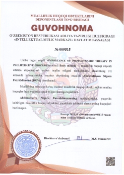 | 597 | №009515 | Ilmiy maqola – "IMPORTANCE OF PHOTODYNAMIC THERAPY IN PROLIFERATIVE PROCESSES" | Abduxalikova Nigora Faxriddinovna (100%) | Abduxalikova Nigora Faxriddinovna | 11/20/2025 | ![]() |