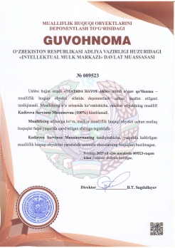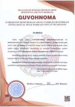 | 594 | №009518 | Darslik – "MAYDA UY, LABORATORIYA, YOVVOYI VA EKZOTIK HAYVONLAR KASALLIKLARI DIAGNOSTIKASI" | Yunusov Xudoynazar Beknazarovich (50%), Kurbanov Feruz Enatillayevich (50%) | Yunusov Xudoynazar Beknazarovich, Kurbanov Feruz Enatillayevich | 11/20/2025 | ![]() |