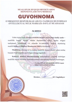 | 590 | №009522 | "SAHNA, RASSOM, HAYOT"nomli ilmiy-badiiy nashr | Kadirova Dilafruz Muxsinovna (100%) | Kadirova Dilafruz Muxsinovna | 11/24/2025 | ![]() |