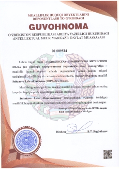 | 588 | №009524 | Monografiya – "МЕДИЦИНСКАЯ ТРМИНОЛОГИЯ КИТАЙСКОГО ЯЗЫКА (на примере хирургических терминов)" | Sultanova Lola Akmalovna (100%) | Sultanova Lola Akmalovna | 11/24/2025 | ![]() |