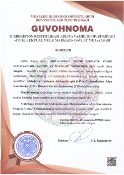 | 592 | №009520 | Ratsionalizatorlik taklifi – "УСОВЕРШЕНСТВОВАНИЕ МЕТОДОВ ДИАГНОСТИКИ КАРДИАЛЬНЫХ НАРУШЕНИИ БОЛЬНЫХ СИСТЕМНОЙ КРАСНОЙ ВОЛЧАНКОЙ" | Miraxmedova Xilola To‘xtasinovna (17%), Mirzaliyeva Anora Arginbayevna (17%), Saidrasulova Gulizebo Baxtiyor qizi (17%), Nizametdinova Ulugoy Jamin qizi (17%), Srojidinov Sardoriddin Shamsitdin o‘g‘li (16%), Xaytimbetov Jumamurat Shamuratovich (16%) | Miraxmedova Xilola To‘xtasinovna, Mirzaliyeva Anora Arginbayevna, Saidrasulova Gulizebo Baxtiyor qizi, Nizametdinova Ulugoy Jamin qizi, Srojidinov Sardoriddin Shamsitdin o‘g‘li, Xaytimbetov Jumamurat Shamuratovich | 11/24/2025 | ![]() |
